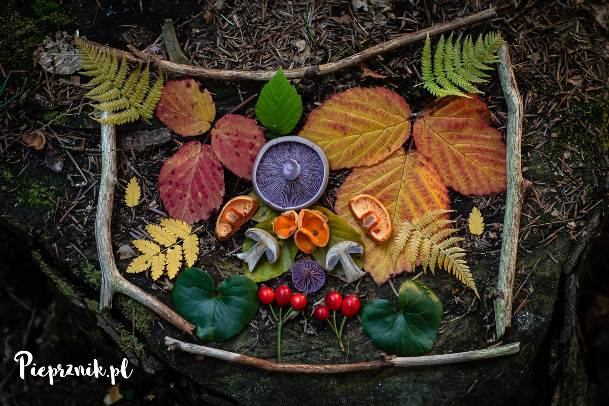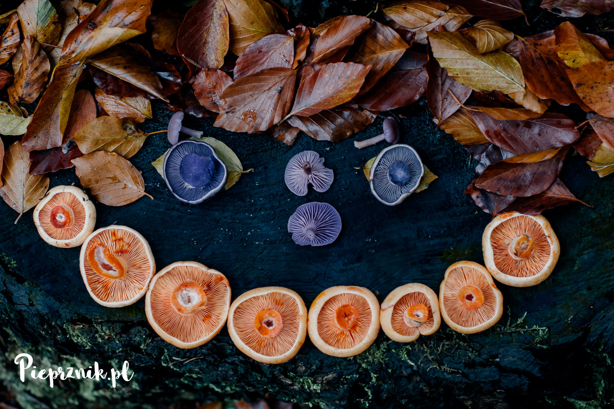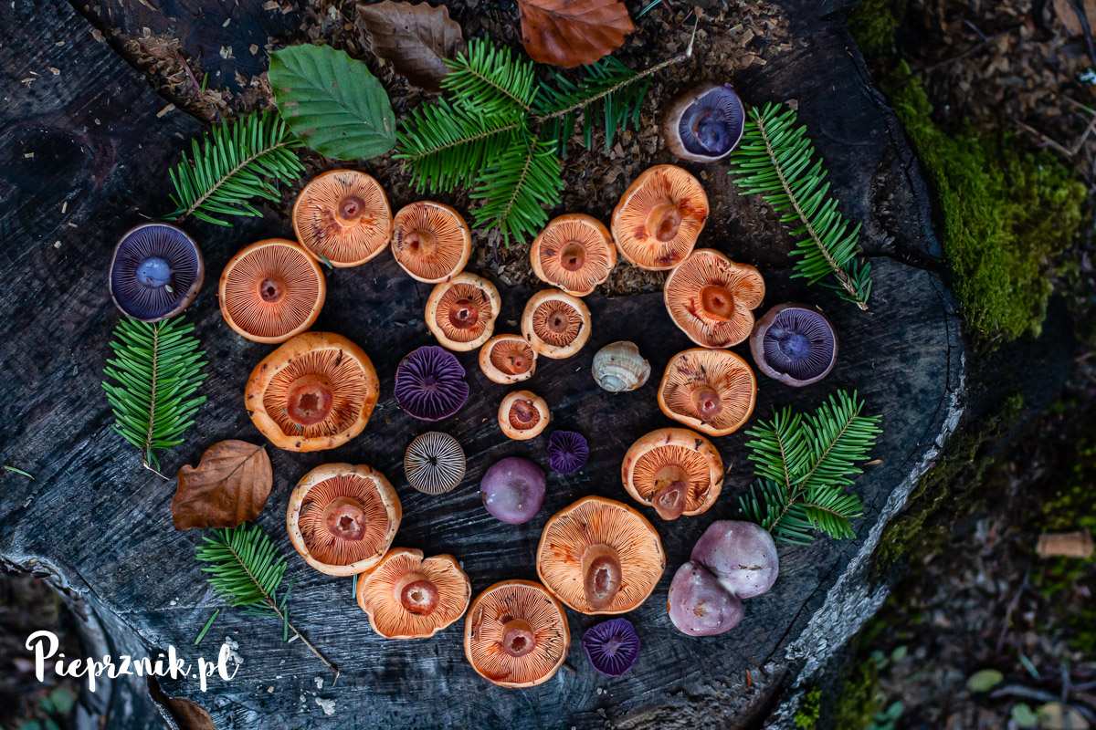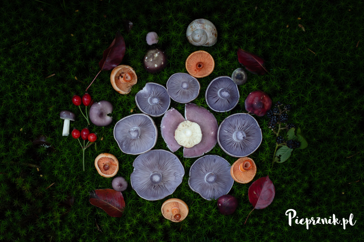 Dominujące kolory: pomarańczowy (wiadomo – rydzowy) oraz fiolet. Rośnie tu bowiem dużo fioletowych grzybów: lakówki ametystowe, gąsówki fioletowawe, dominują gołąbki właśnie o fioletowym zabarwieniu.