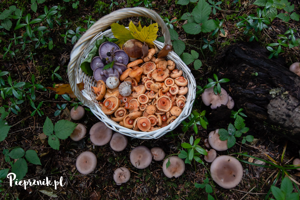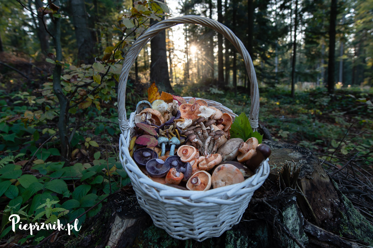 Kosz kolorowych grzybów, a w nim: rydze, opieńki, gąsówki, kolczaki, pierścieniaki, kilka borowików, koźlarz, lakówki