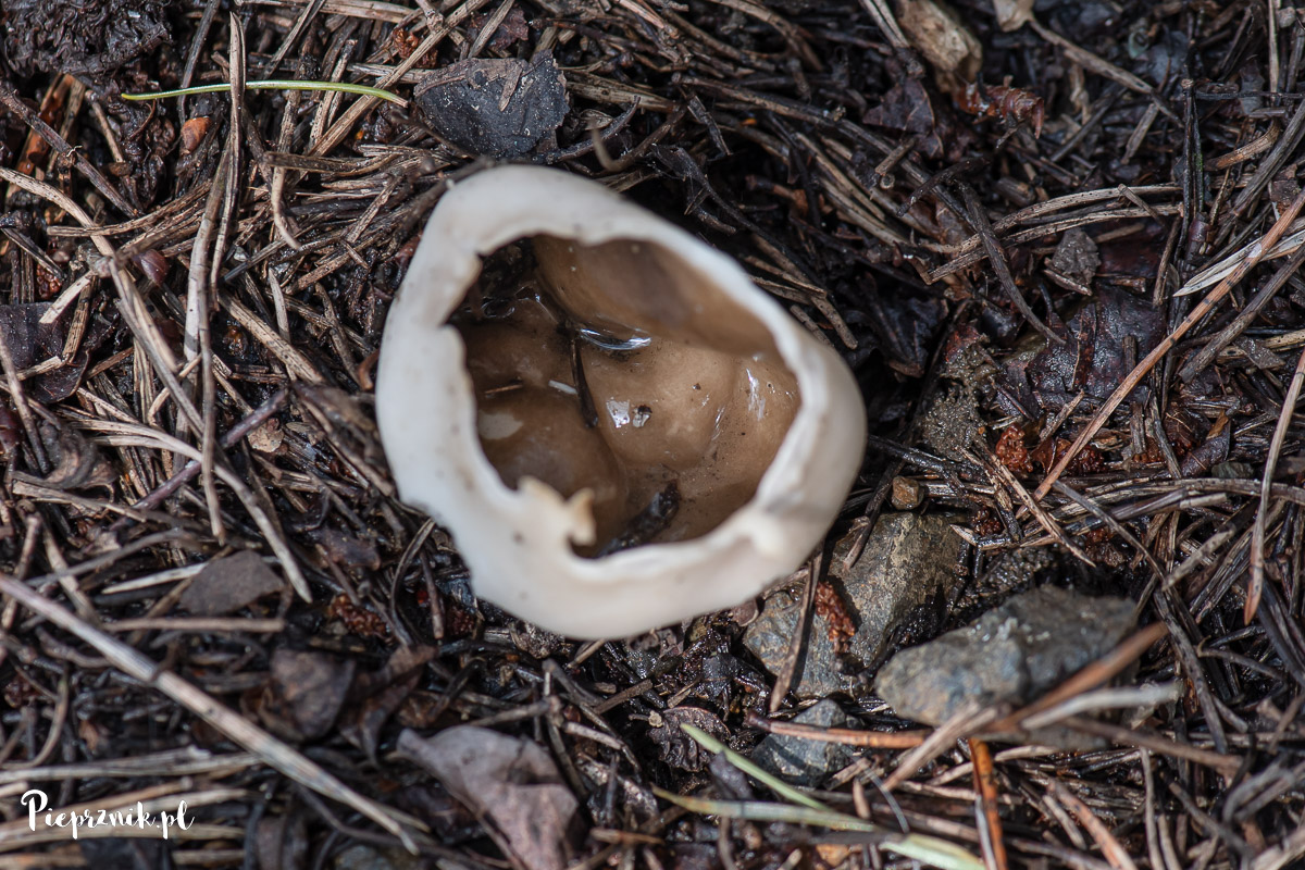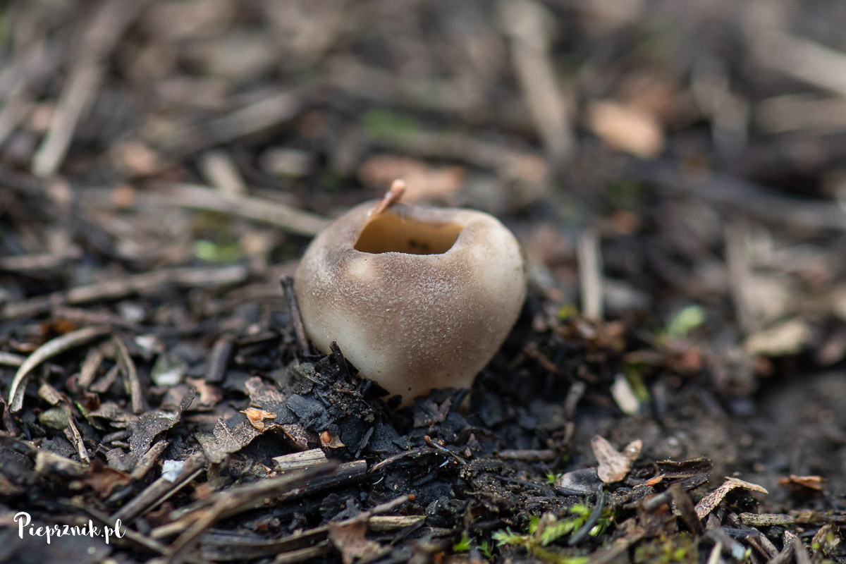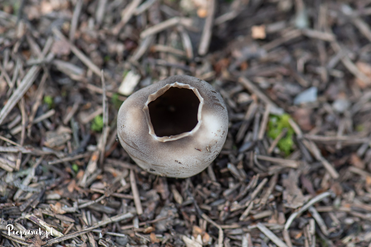 Owocnik pucharkowaty, miseczkowaty, kubeczkowaty, niewielki (o średnicy do 3 cm), w kolorze beżowym (u młodych), do ciemnobrązowego, przeważnie z szarawym zabarwieniem. Im bliżej trzonu, tym jaśniejsze. Czasem “marmurkowaty”, gdzie jaśniejsze barwy przeplatają się z ciemniejszymi na całej miseczce. Niektóre owocniki w całości nietypowo jasne.