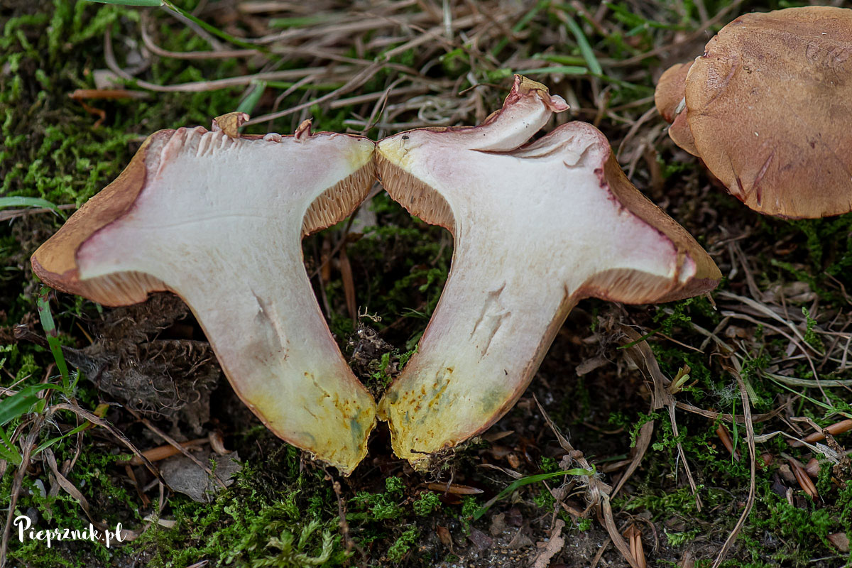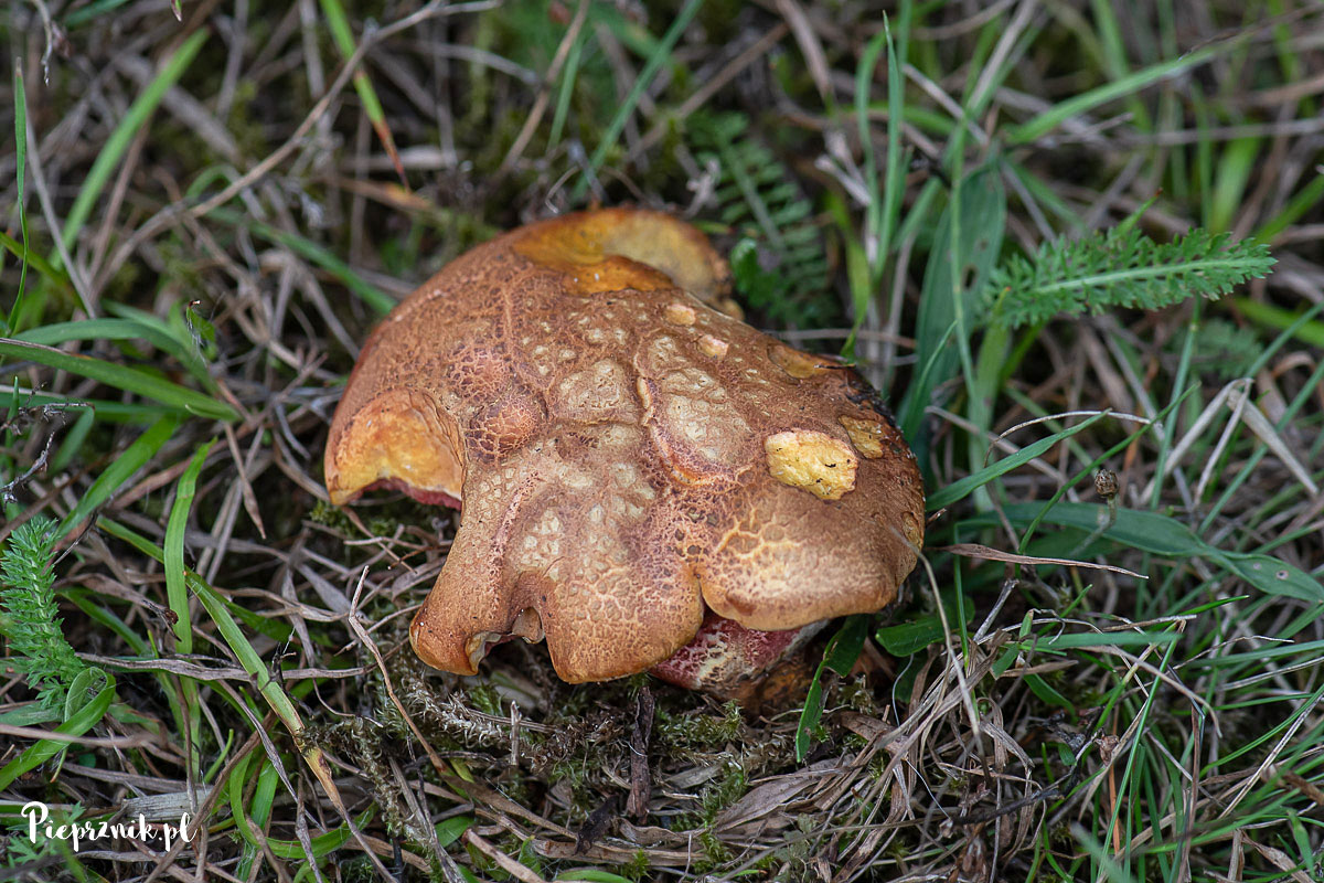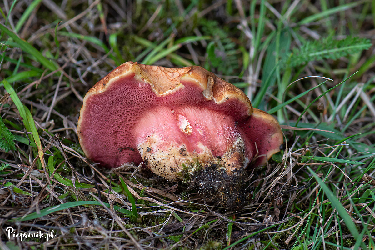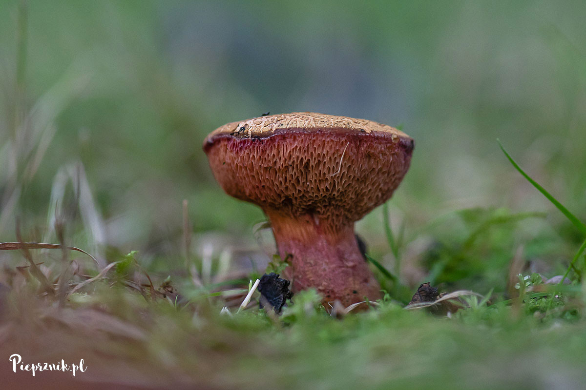 Oczywiście robi wrażenie karminowy / rubinowy spód kapelusza oraz kolor trzonu, zwłaszcza u młodych owocników. Praktycznie nigdy nie jestem zadowolona ze zdjęć maślaczka rubinowego. Może dlatego, że najczęściej trafiam na starsze, już nie tak barwne owocniki? A może chodzi o środowisko – park, często zaśmiecony, do tego trawiaste, rozpraszające podłoże? A może wymyślam 😀